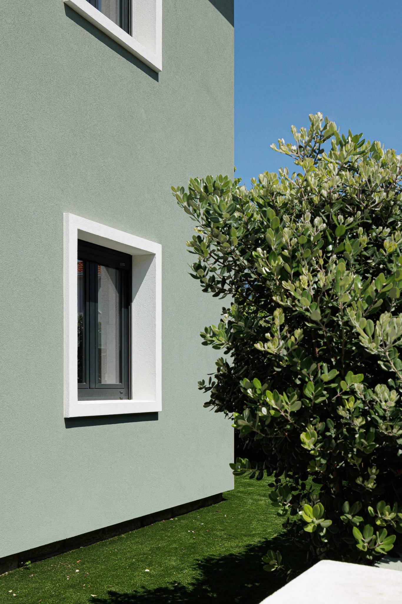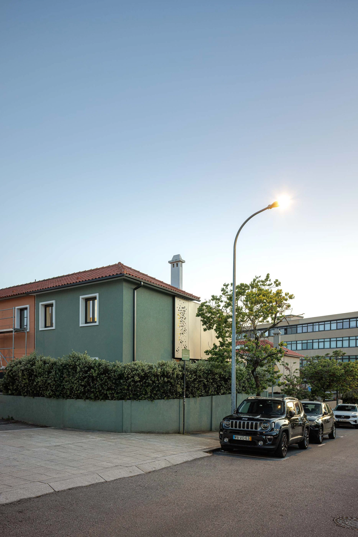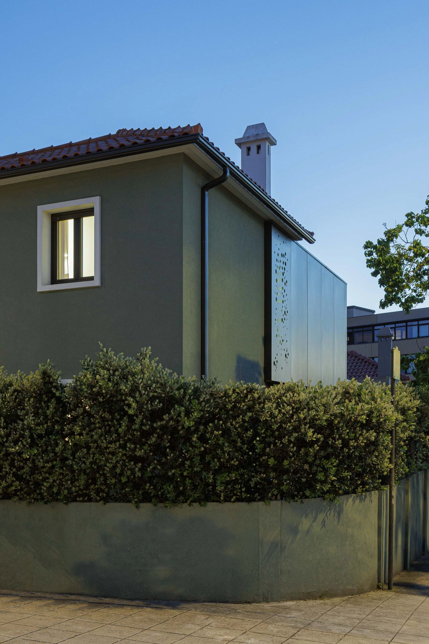 A moradia desenvolve-se em dois volumes distintos, respeitando os diferentes tempos de intervenção e criando uma relação equilibrada entre o existente e o novo. No alçado nascente, a alteração é mínima, limitando-se à mudança de cor, enquanto o alçado poente apresenta uma linguagem arquitetónica distinta, com vãos maiores e menos rígidos, abrindo completamente o rés-do-chão para o exterior e fortalecendo a relação interior/exterior. Este alçado dialoga com os edifícios multifamiliares vizinhos, estabelecendo uma conexão visual mais próxima.