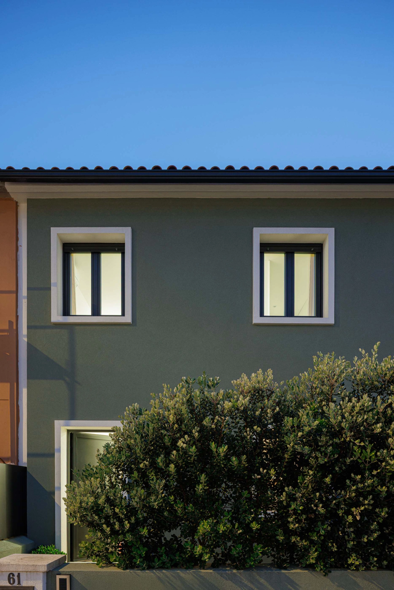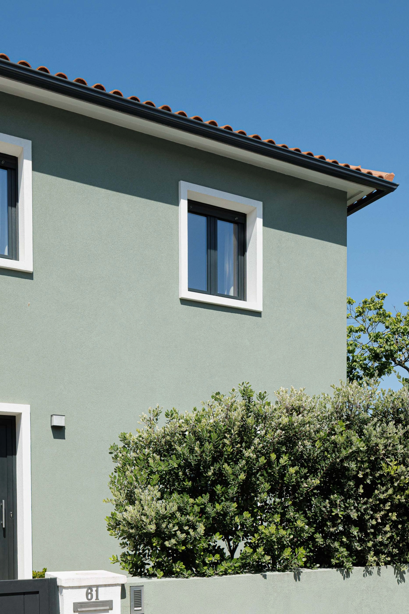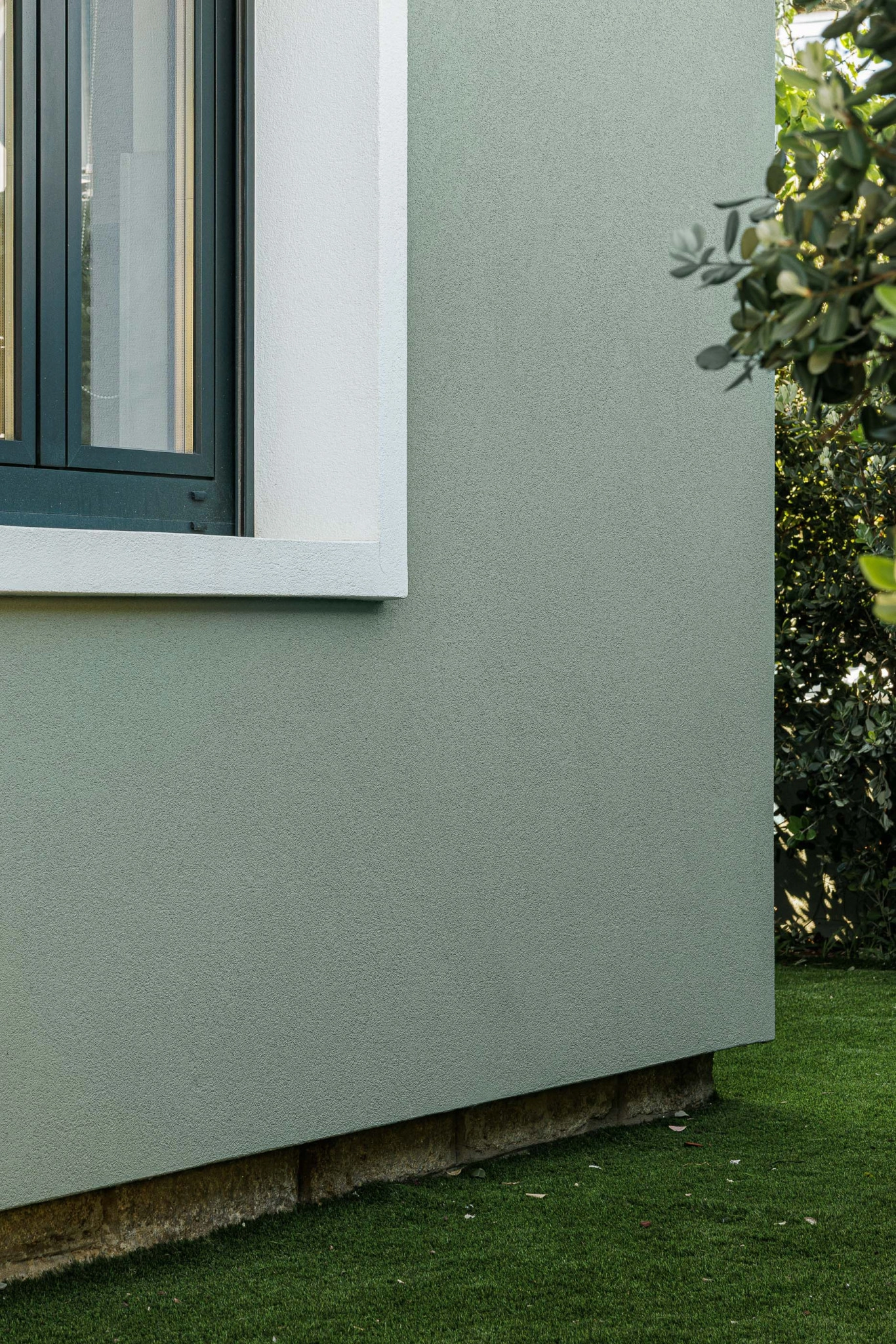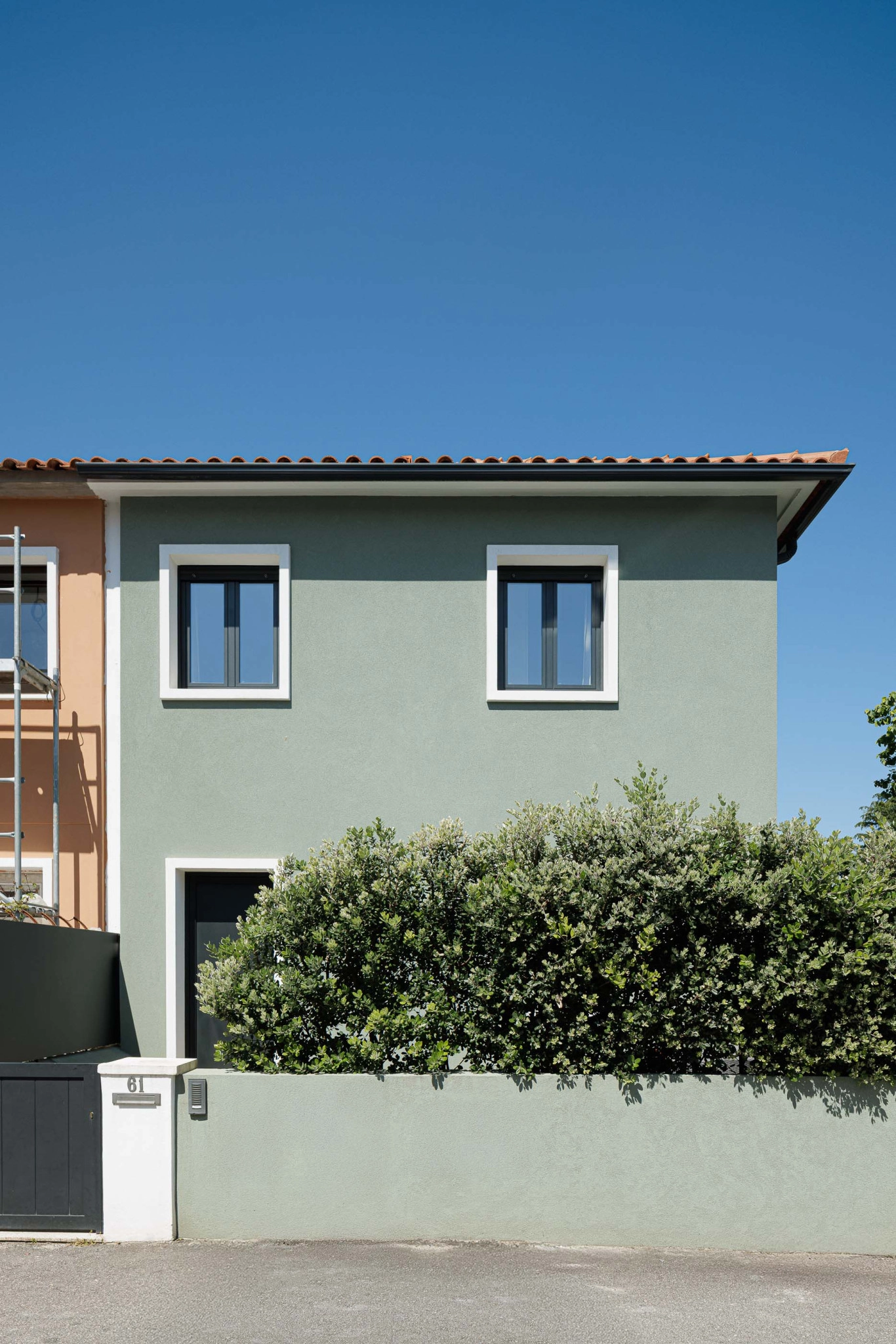 A moradia desenvolve-se em dois volumes distintos, respeitando os diferentes tempos de intervenção e criando uma relação equilibrada entre o existente e o novo. No alçado nascente, a alteração é mínima, limitando-se à mudança de cor, enquanto o alçado poente apresenta uma linguagem arquitetónica distinta, com vãos maiores e menos rígidos, abrindo completamente o rés-do-chão para o exterior e fortalecendo a relação interior/exterior. Este alçado dialoga com os edifícios multifamiliares vizinhos, estabelecendo uma conexão visual mais próxima.