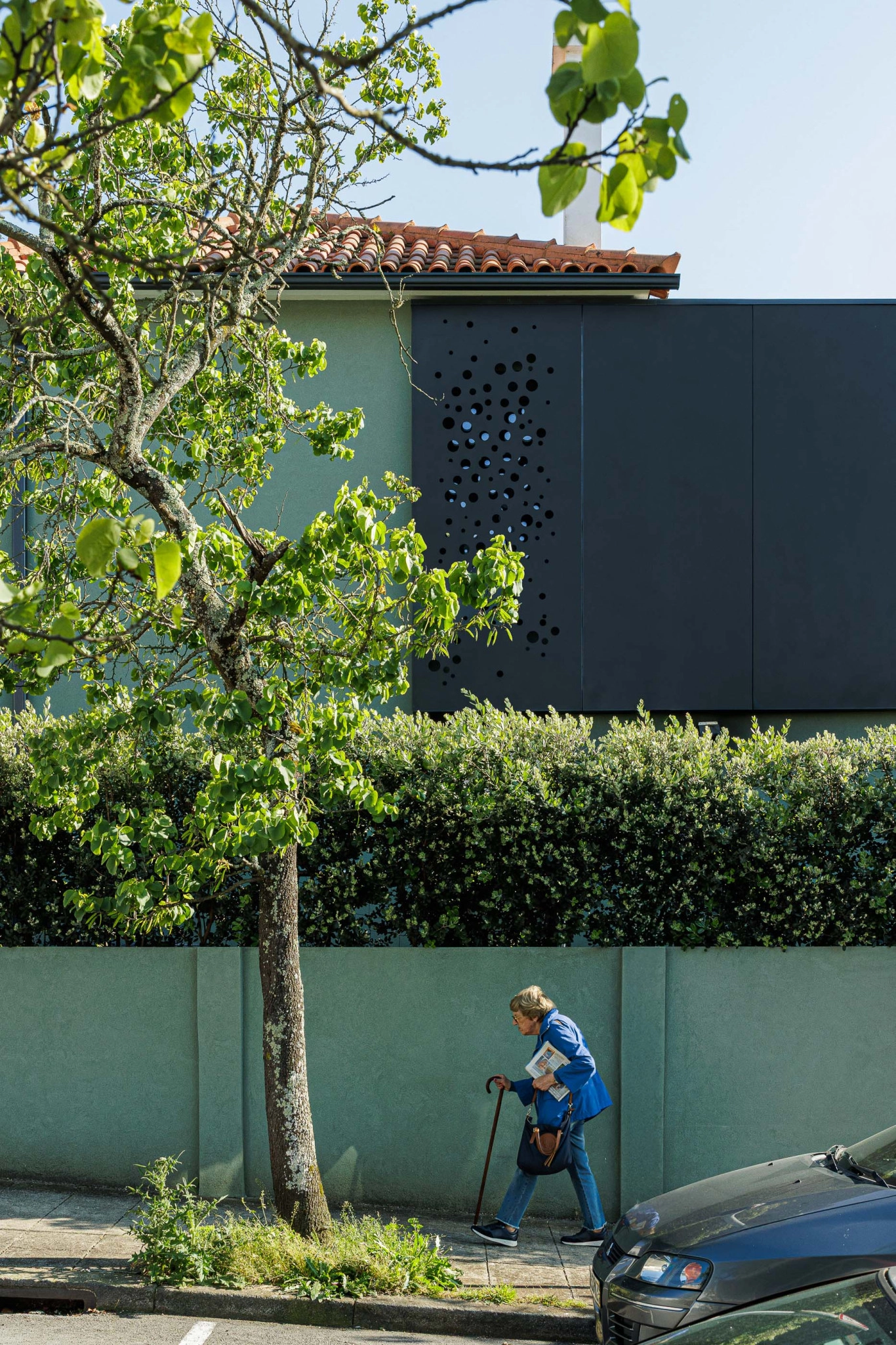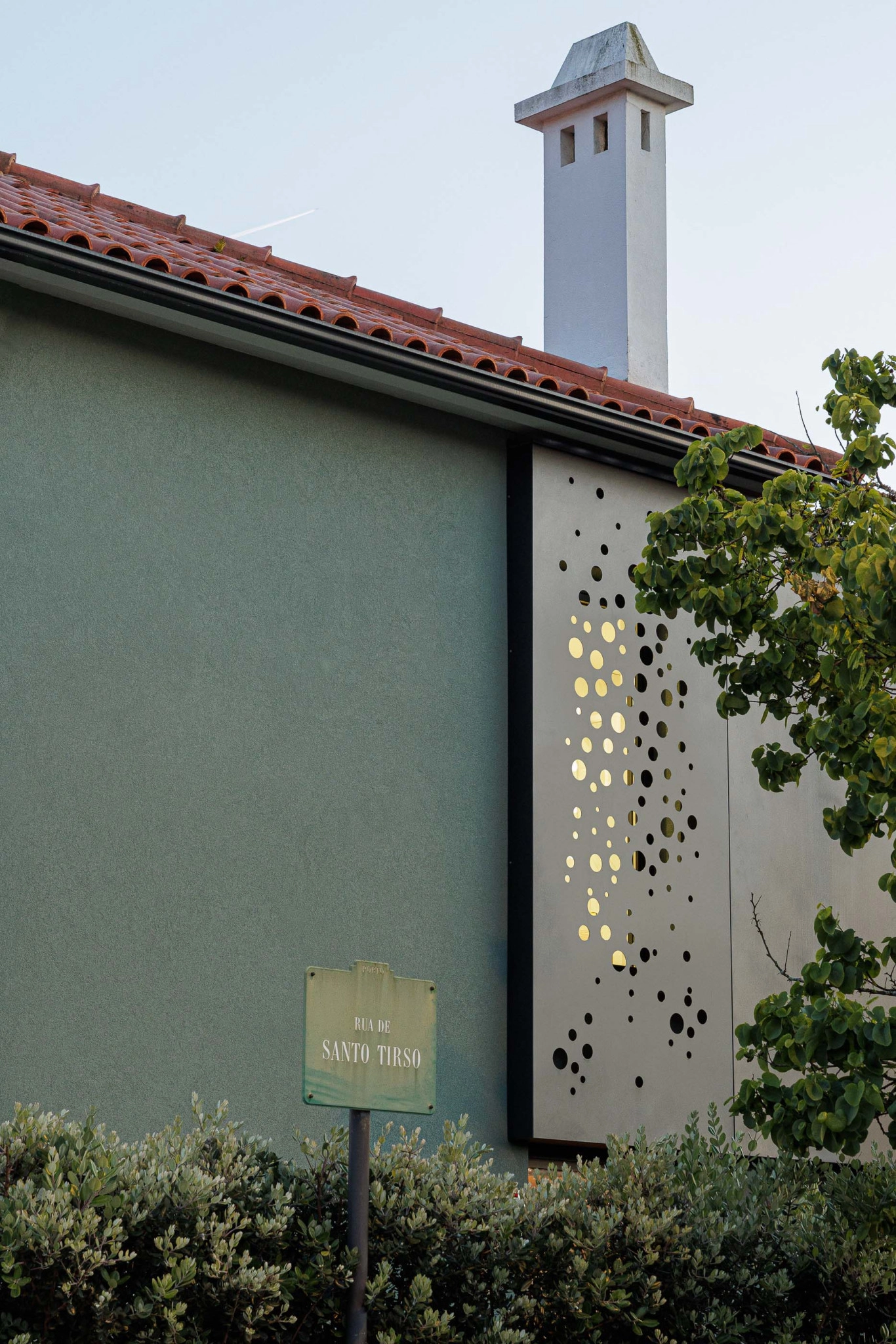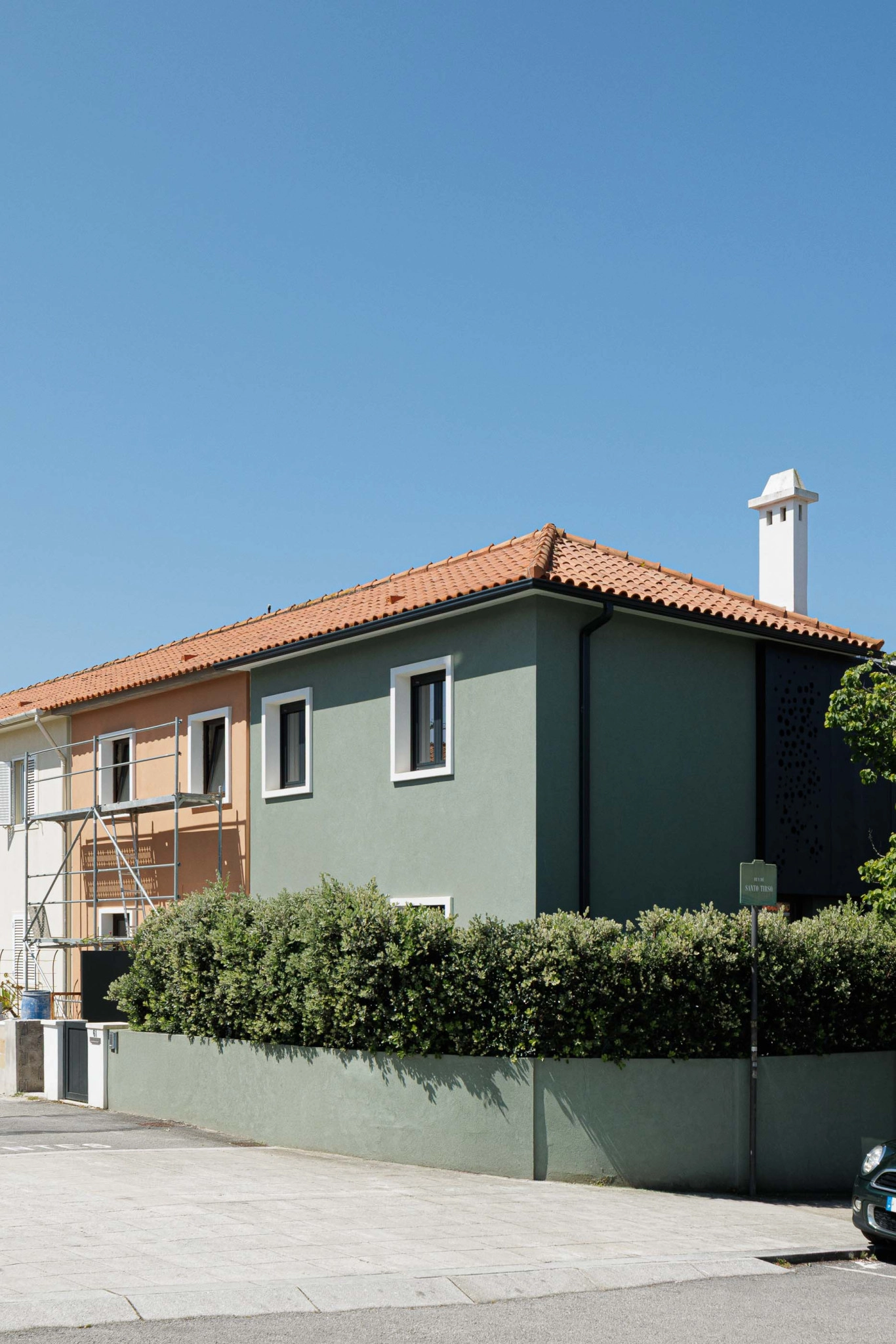 A garagem, essencial para a moradia, é integrada no muro de vedação, abrindo-se para a Rua Santo Tirso e permitindo o acesso do automóvel ao interior. Uma longa janela no alçado poente da garagem proporciona luz natural e ventilação.