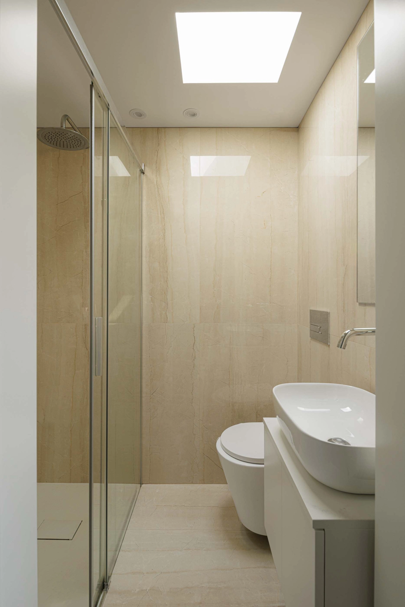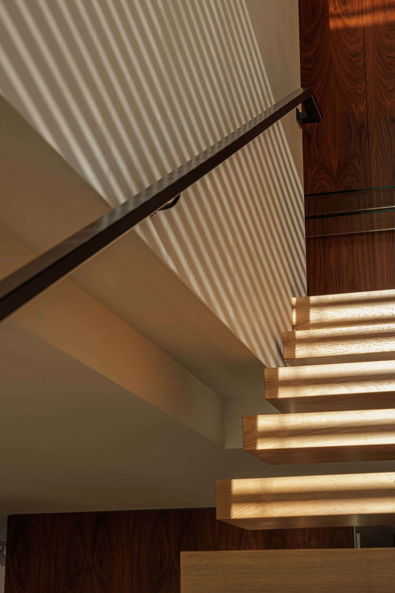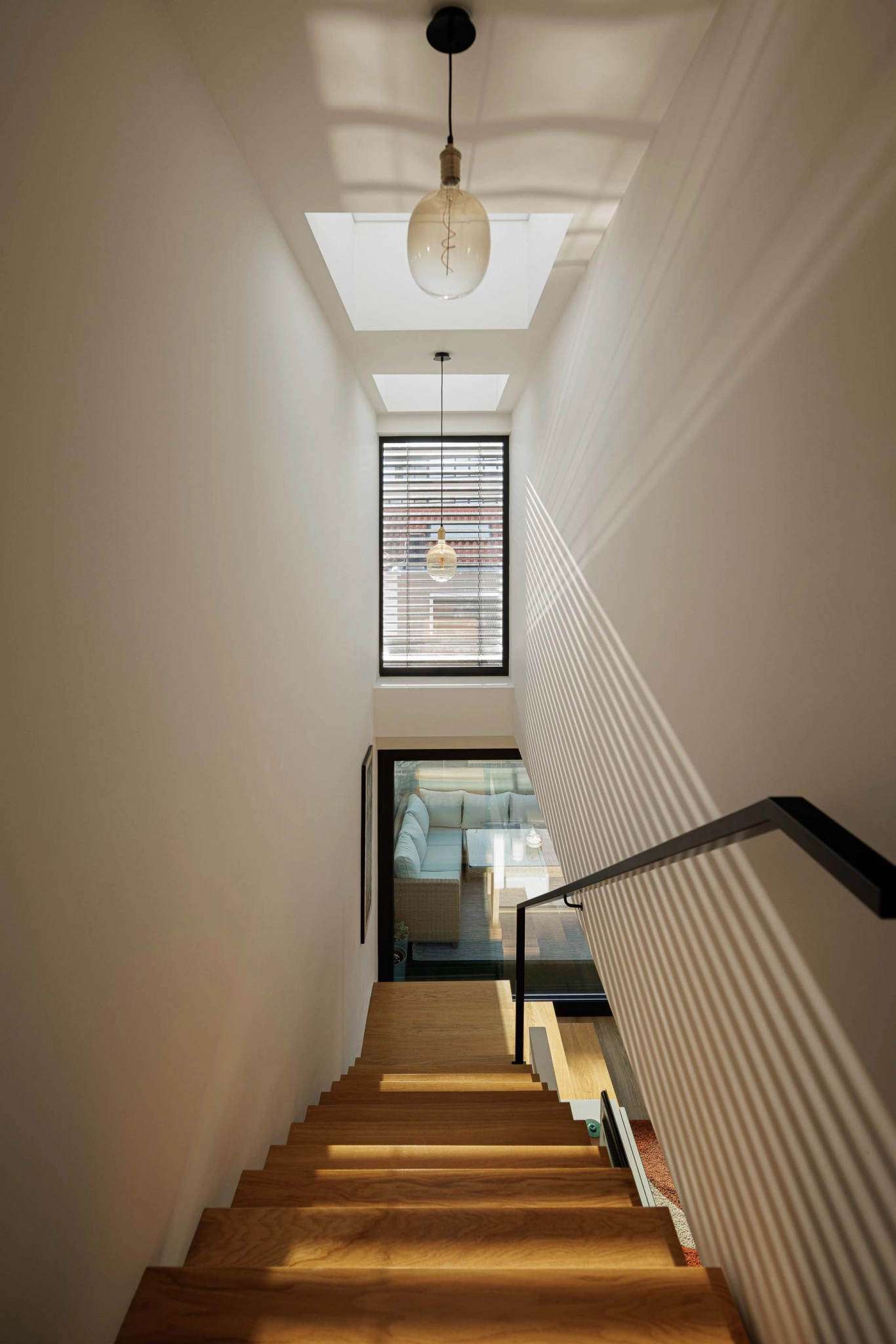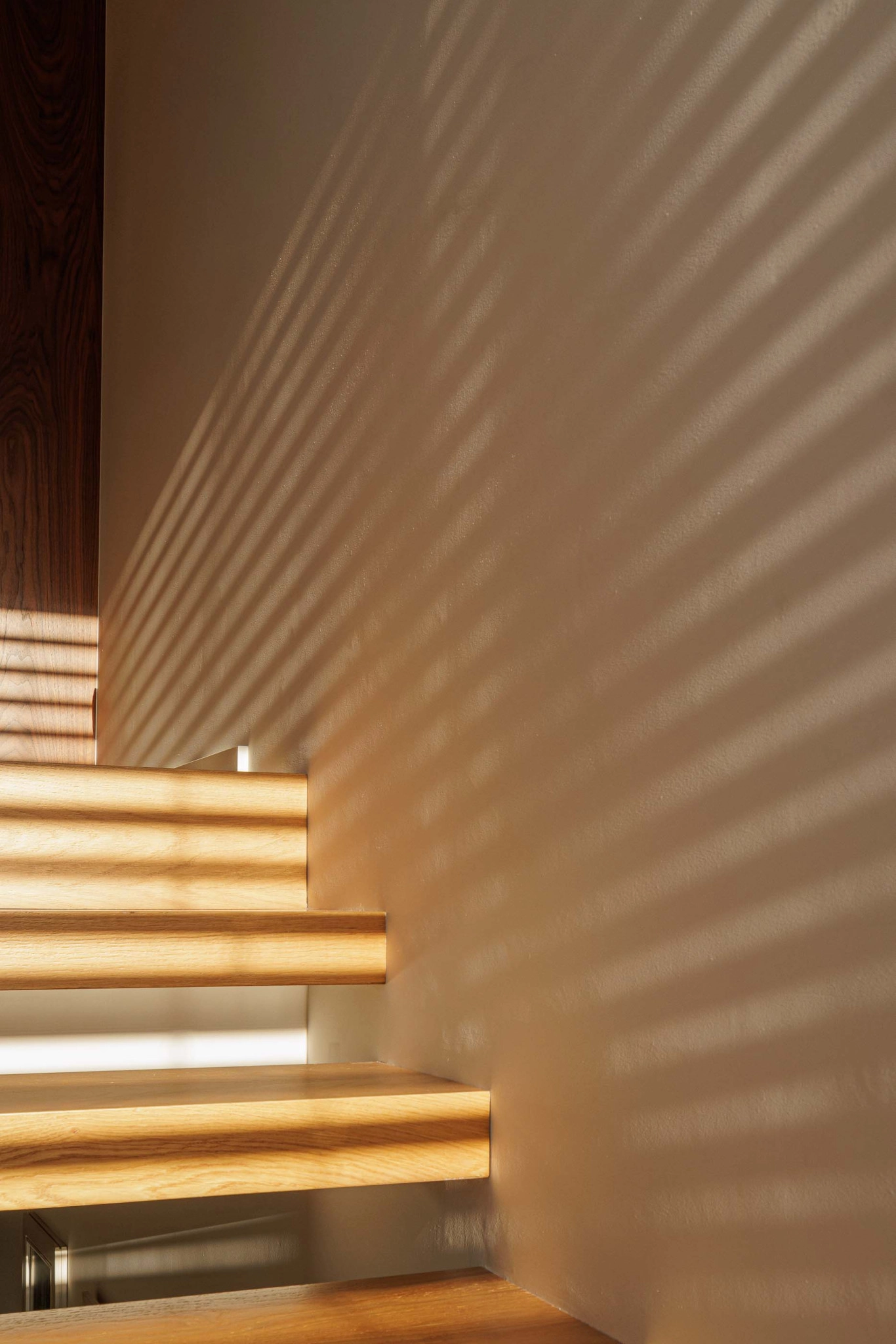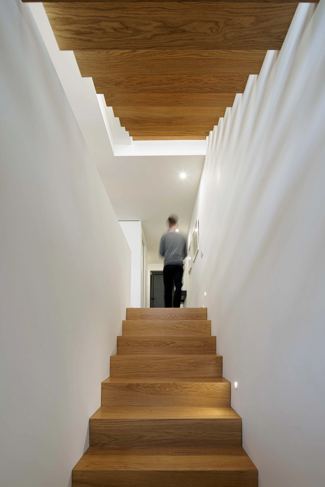 A localização da caixa de escadas junto à parede sul e a presença de um ponto de luz zenital garantem uma iluminação natural eficiente, beneficiando a moradia cuja orientação solar é limitada. A construção nova será dotada das mesmas características térmicas e acústicas do edifício existente, com paredes exteriores isoladas pelo interior e acabadas com placas de gesso cartonado. As paredes exteriores desenterradas serão construídas com bloco térmico e sistemas ETICS pelo exterior. A fachada ventilada em fenólico será aplicada no piso 1 da ampliação, incluindo um painel perfurado na fachada norte para iluminação e ventilação.