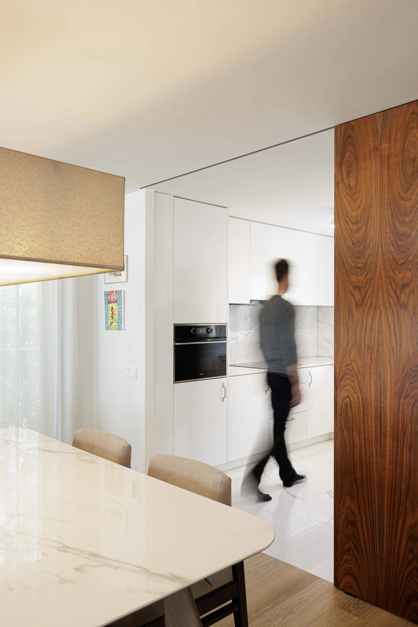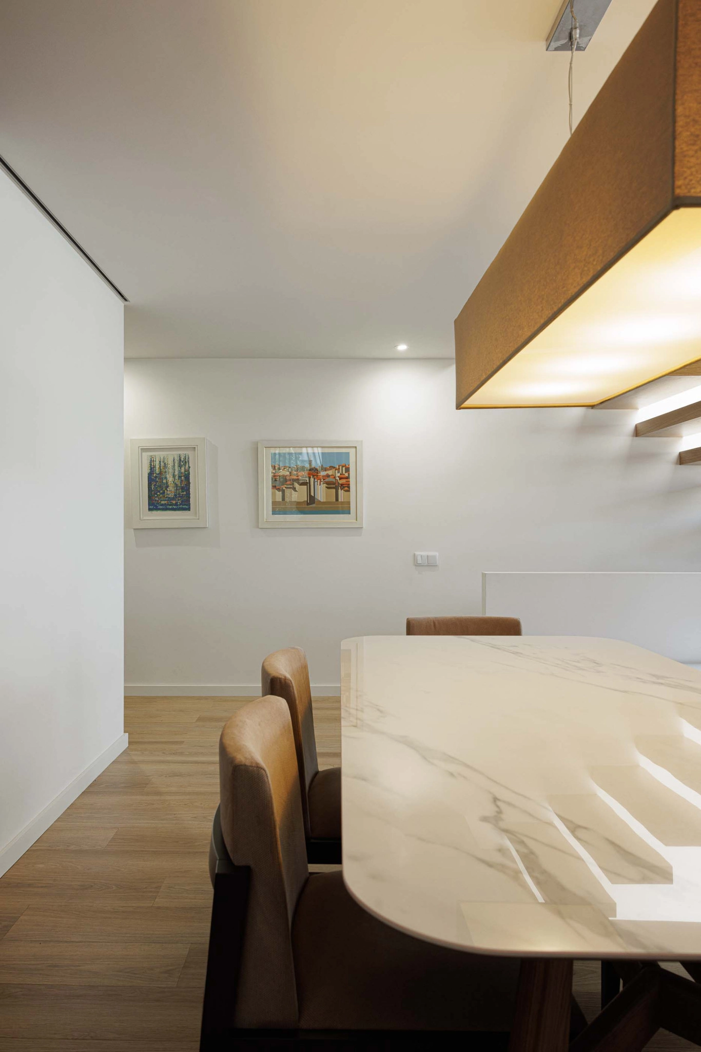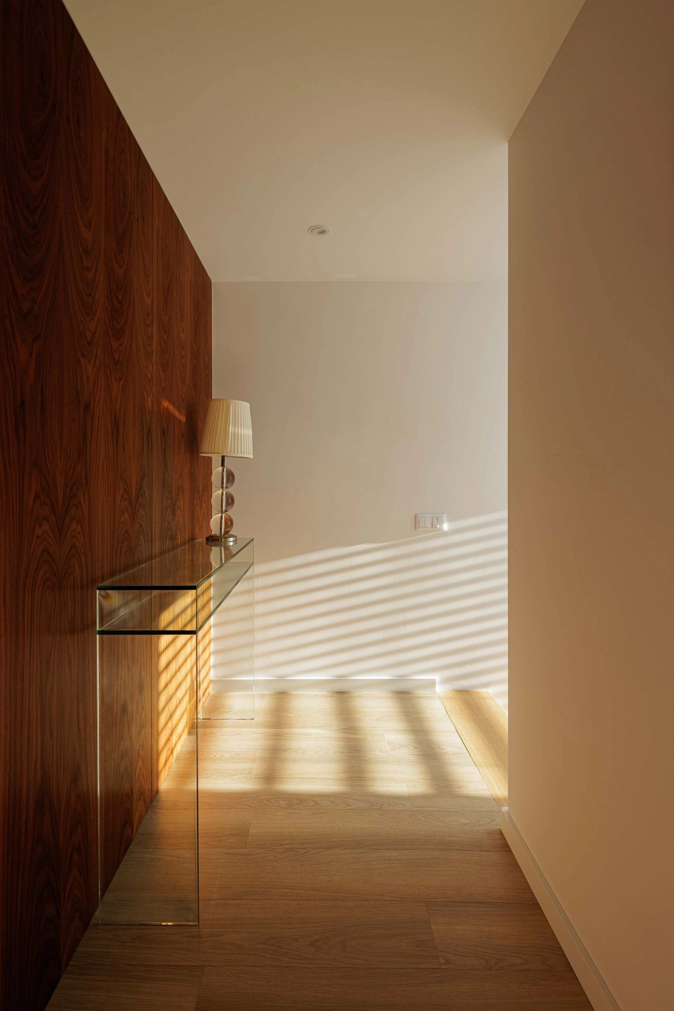 O interior da Casa PI é organizado ao longo de um eixo longitudinal marcado pela caixa de escadas, claraboia e vitral, que distribui os espaços. O hall de entrada, situado em um dos extremos do eixo, leva a um corredor que se abre para a área social composta por sala de estar, sala de jantar e cozinha, além de uma pequena instalação sanitária de serviço. A caixa de escadas conecta ao piso superior, onde se encontram dois quartos, um escritório e uma instalação sanitária comum, bem como ao piso -1, que abriga a lavandaria e a garagem.