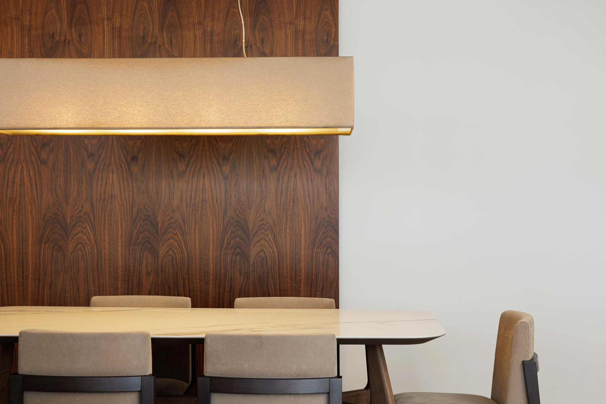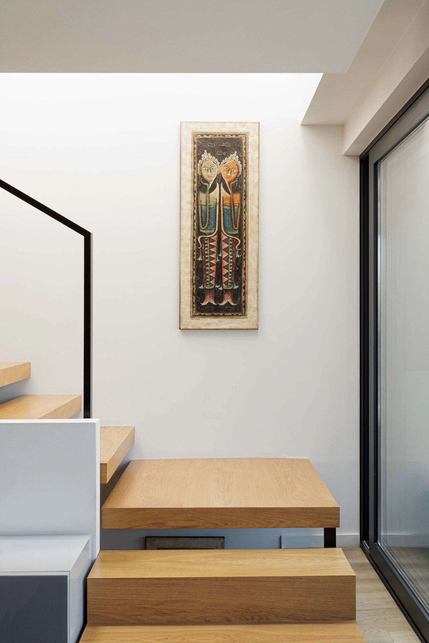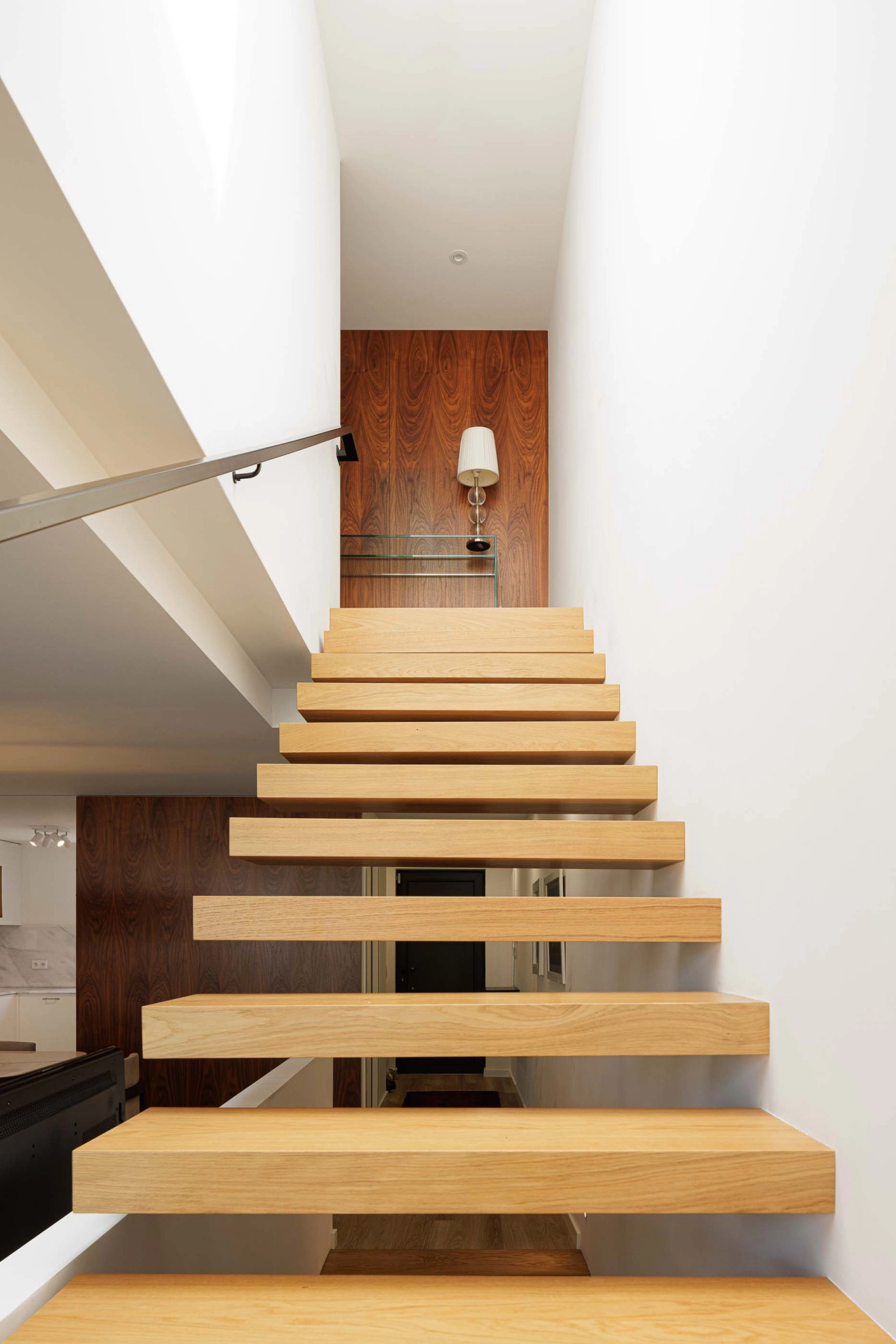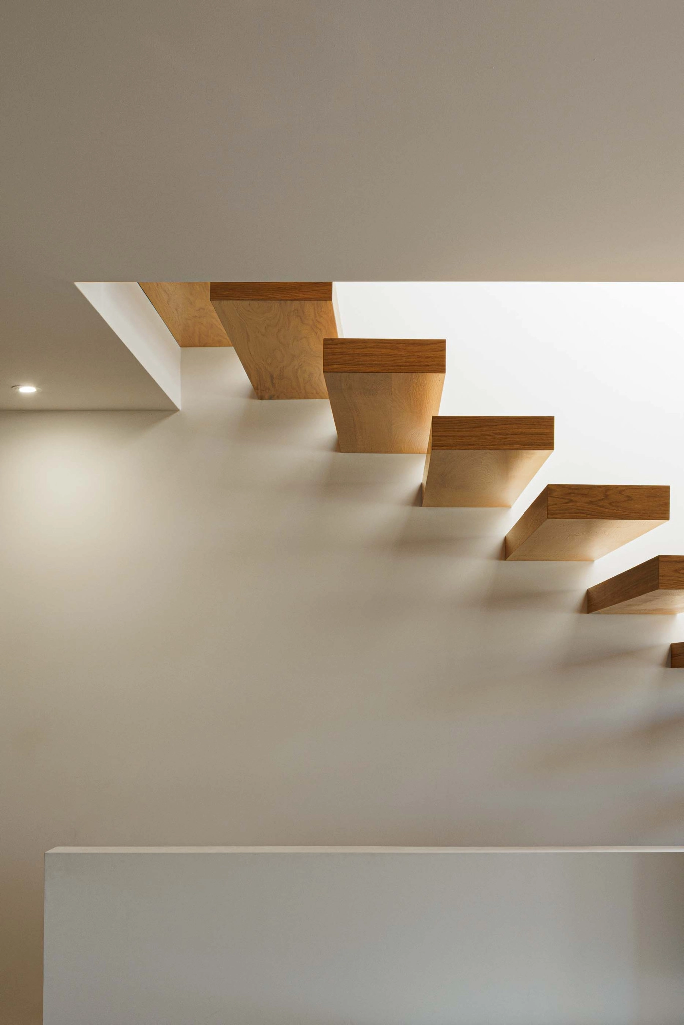 O interior da Casa PI é organizado ao longo de um eixo longitudinal marcado pela caixa de escadas, claraboia e vitral, que distribui os espaços. O hall de entrada, situado em um dos extremos do eixo, leva a um corredor que se abre para a área social composta por sala de estar, sala de jantar e cozinha, além de uma pequena instalação sanitária de serviço. A caixa de escadas conecta ao piso superior, onde se encontram dois quartos, um escritório e uma instalação sanitária comum, bem como ao piso -1, que abriga a lavandaria e a garagem.